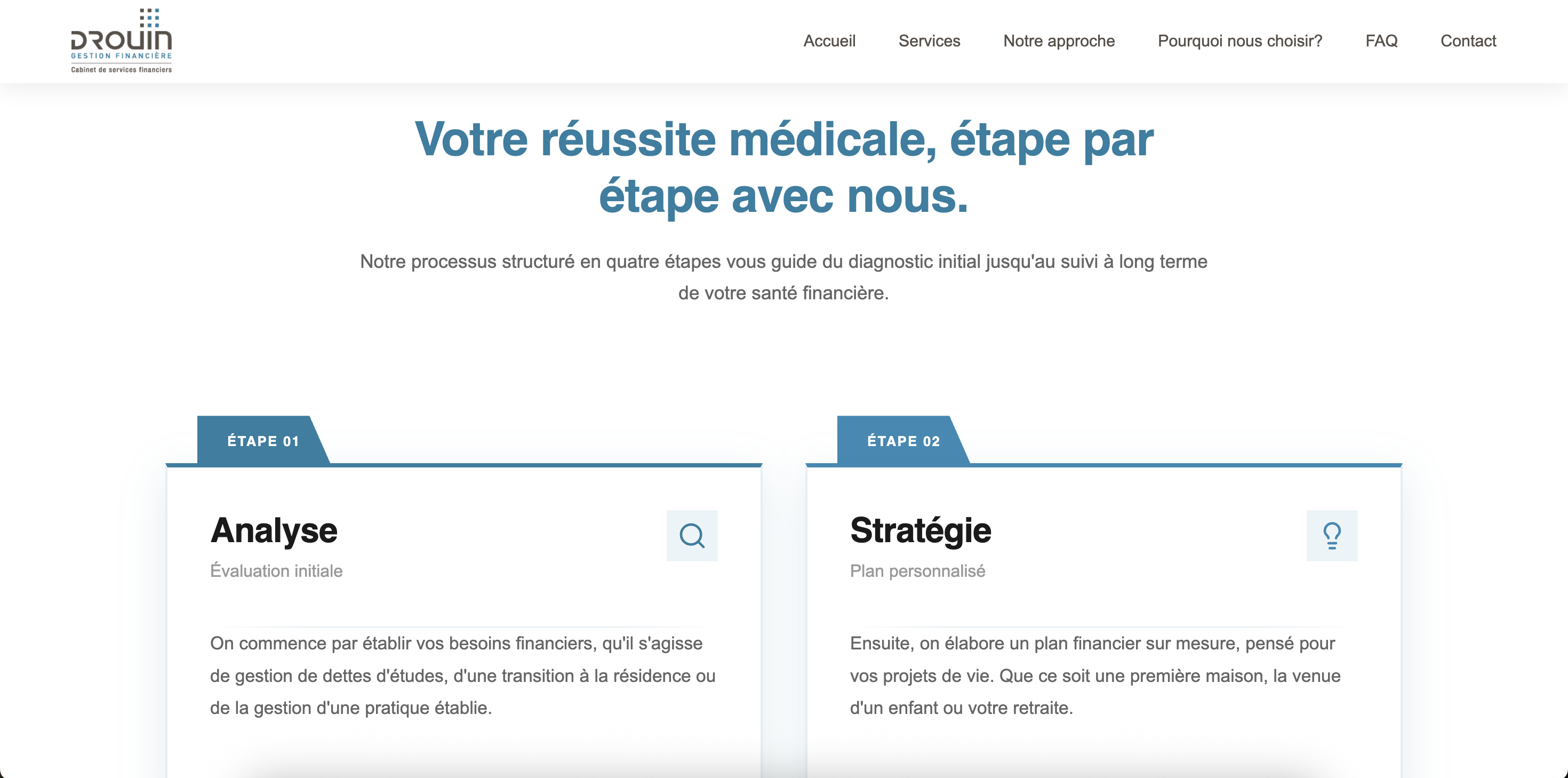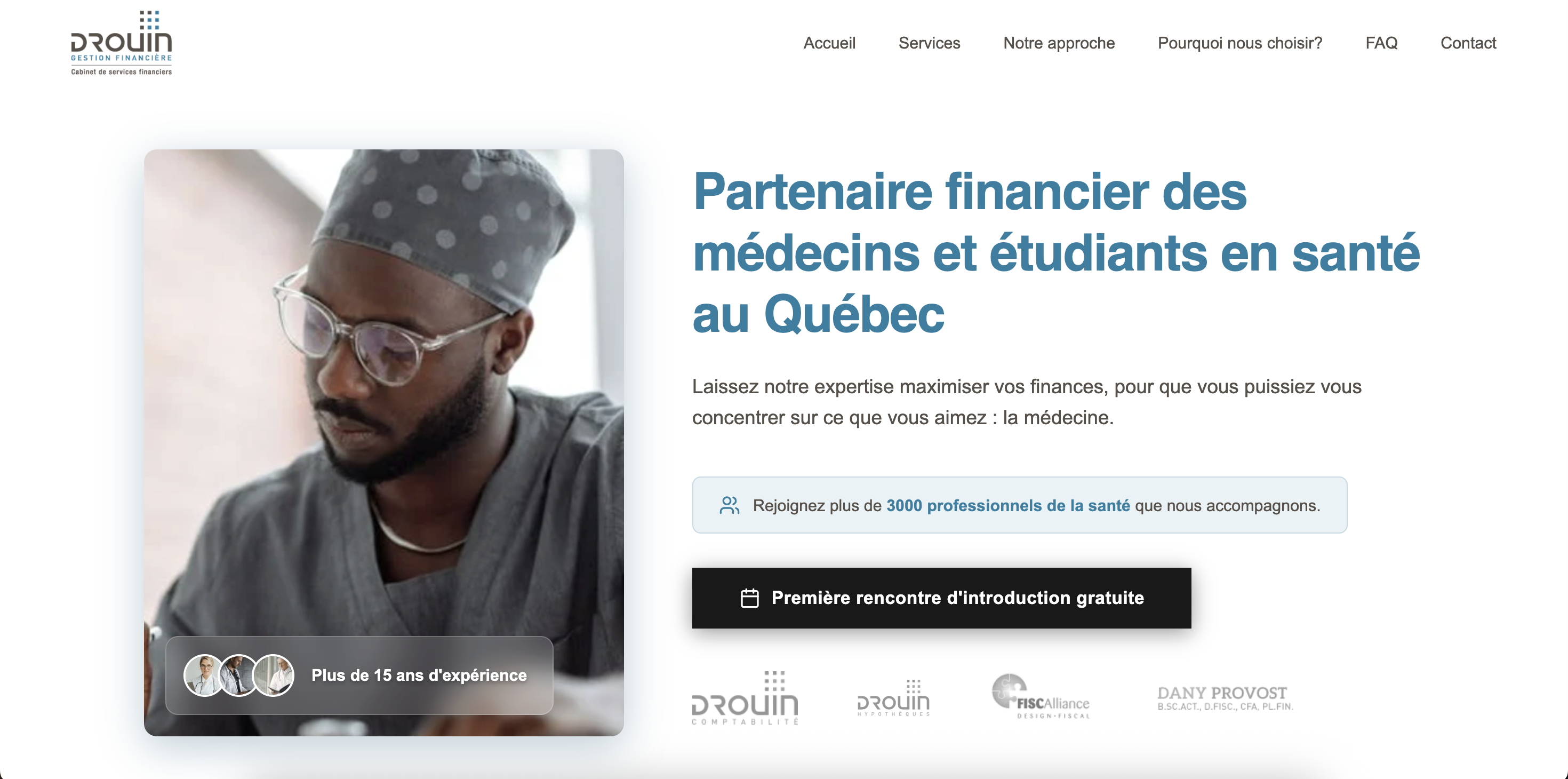 Le projet consistait à concevoir et développer un site web pour Drouin Gestion Financière, un partenaire financier dédié aux médecins et aux étudiants en santé du Québec. Le mandat visait à mettre de l’avant l’ensemble des services et des avantages offerts par l’entreprise à travers une vitrine numérique moderne, claire et structurée. L’objectif était de renforcer la crédibilité de Drouin Gestion Financière, de faciliter la compréhension de son offre et de soutenir l’acquisition de nouveaux clients grâce à une présence web professionnelle et efficace.